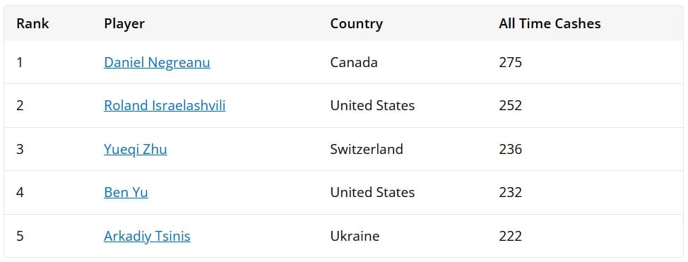 Daniel Negreanu(丹牛)以275次奖励圈的恐怖数据独占鳌头,同时坐拥7条金手链和64次决赛桌记录。紧随其后的是Roland Israelashvili,252次奖励圈的成绩单上,最亮眼的是他在2024年WSOP线上400美元买入PLOSSUS赛事(2024 WSOP Online $400 ‘PLOSSUS’)中终结了金手链魔咒(注:PLOSSUS为底池限注奥马哈与七张牌梭哈混合赛事)。