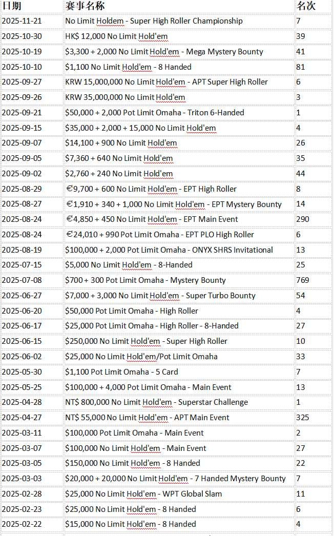 从Triton系列到WSOP,再到APT赛事,这一年,他的多次高额奖金表现、进入决赛桌以及获得冠亚军的能力,标志着他依然保持着高水平的竞技状态。
